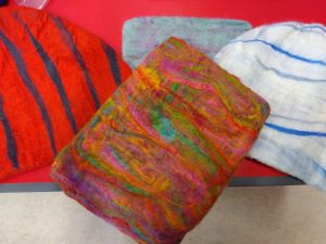 It has been so lovely to get through the cold months by sharing my craft experience with so many students. I was delighted to see the monotones in the teardrop enamelled pieces and some of the textures created on the silver clay were amazing. Speaking of texture, we had great fun making felt at Abberton Reservoir on Saturday – some tea cosies, I pad covers and even little friends were made.